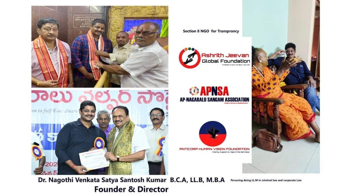 Through Ashrith Jeevan Global Foundation, Anticorp Human Vision Foundation, AP Nagaralu Sangam Association, and Hands2Help, Dr. N V S Santosh Kumar has built a strong network of NGOs focused on education, women empowerment, healthcare, legal rights, community care, and poverty alleviation.