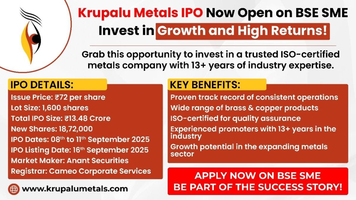 Mumbai (Maharashtra) [India], September 10: Krupalu Metals Ltd has launched its IPO at ₹72 per share, aiming to raise ₹13.48 crore by issuing 18.72 lakh new shares. The offer closes on September 11, and shares are set to list on the BSE SME platform by September 16.