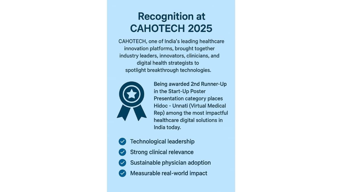 Bhubaneswar (Odisha) [India], November 24: Hidoc has achieved a major milestone as its flagship innovation, Unnati – an AI-powered Virtual Medical Representative (VMR), was awarded the 2nd Runner-Up prize in the Start-Up Poster Presentation category at CAHOTECH 2025, hosted at KIIT, Bhubaneswar, Orissa.